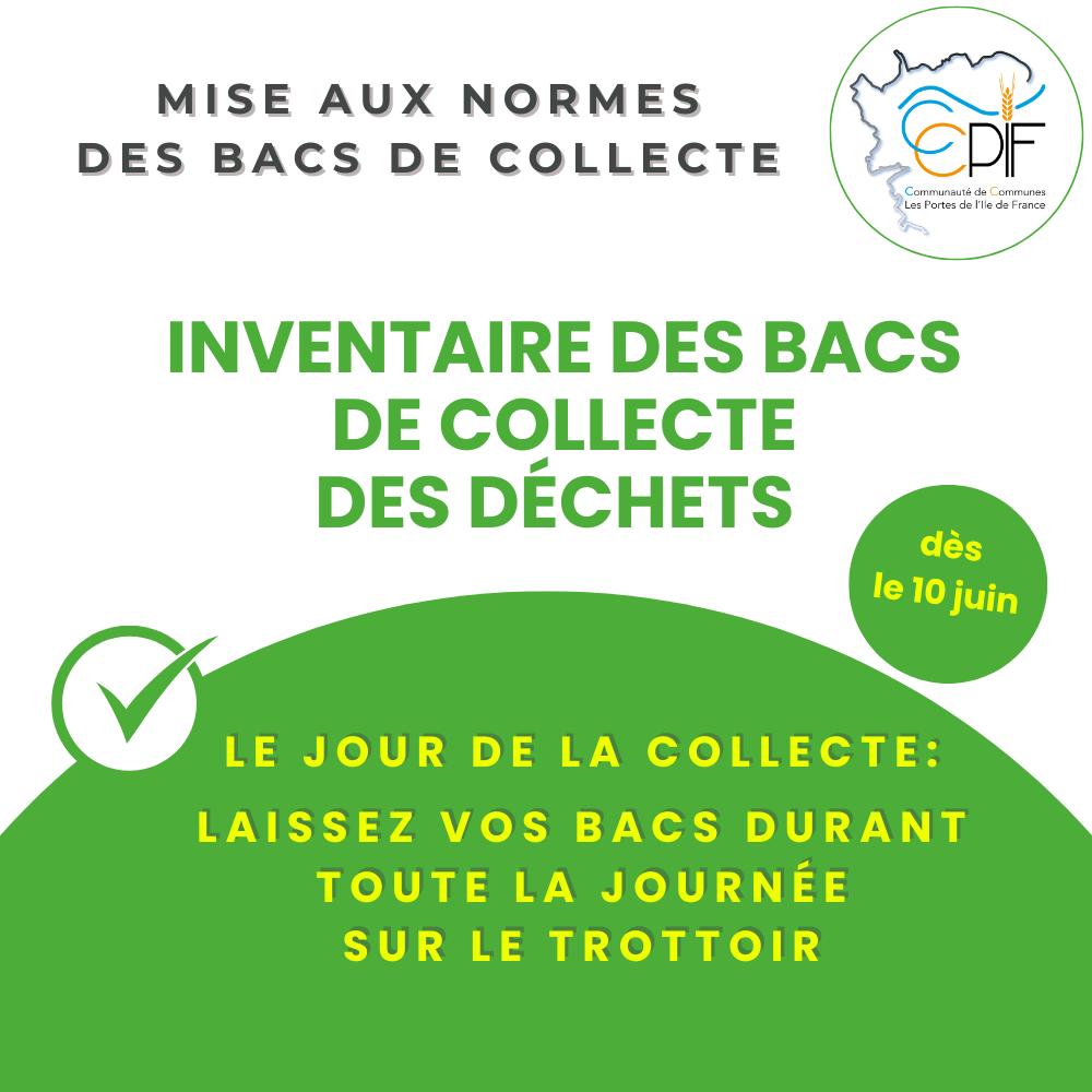 Un inventaire des bacs de collecte des déchets (Ordures Ménagères, Emballages Recyclables Ménagers, Verres) se fera sur l’ensemble des 18 communes de la Communauté de Communes des Portes de l’Ile-de-France à partir du lundi 10 juin. A cet effet, il vous est demandé de laisser vos bacs durant toute la journée de collecte sur le trottoir.
